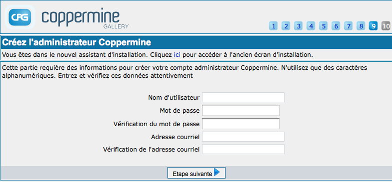 | Cette section demande les informations pour la création de votre compte administrateur. N'entrez que des caractères alphanumériques. Entrez les données avec soin ! | Entrez ici un nom d'administrateur et un mot de passe. Assurez-vous de bien les mémoriser, ou notez les dans un endroit sûr; vous ne pourrez plus administrer votre galerie si vous perdez ces données. |